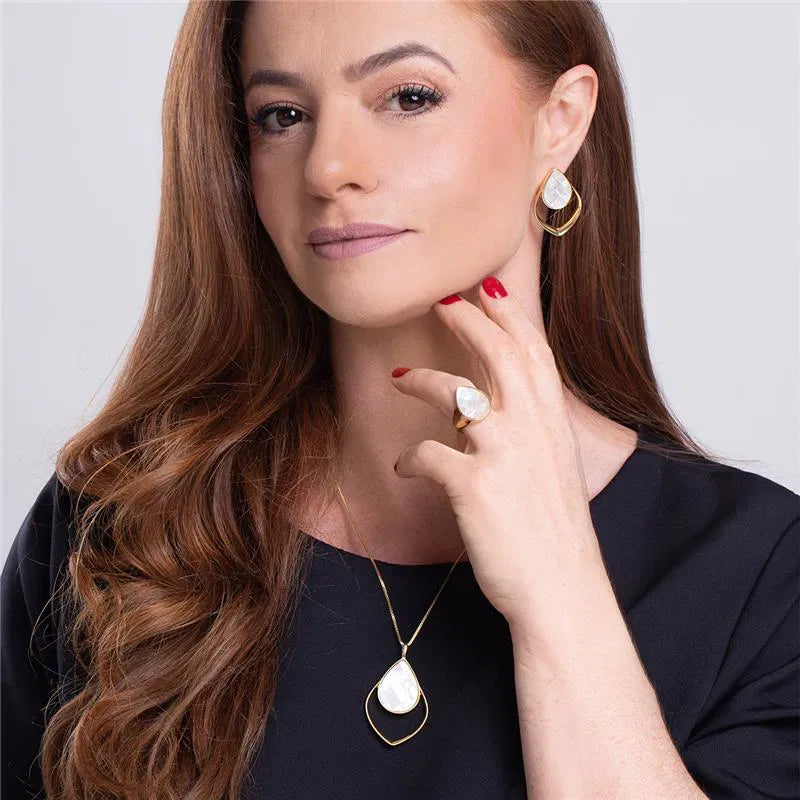 Make a statement with this stunning 18K gold-plated ring, featuring a mosaic mother-of-pearl gemstone that catches the light with soft iridescent glow.