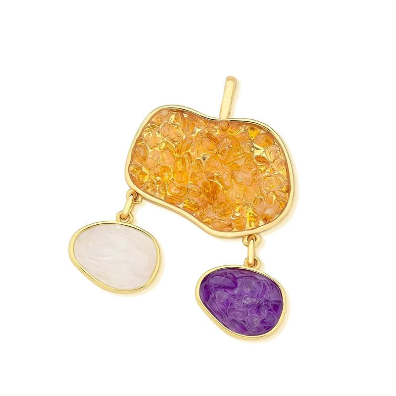 This 18K gold-plated pendant, measuring 5 cm in height, showcases a unique combination of natural gemstones. Each piece features a distinctive arrangement of fragmented stones in varied colors and shapes, ensuring no two pendants are alike.