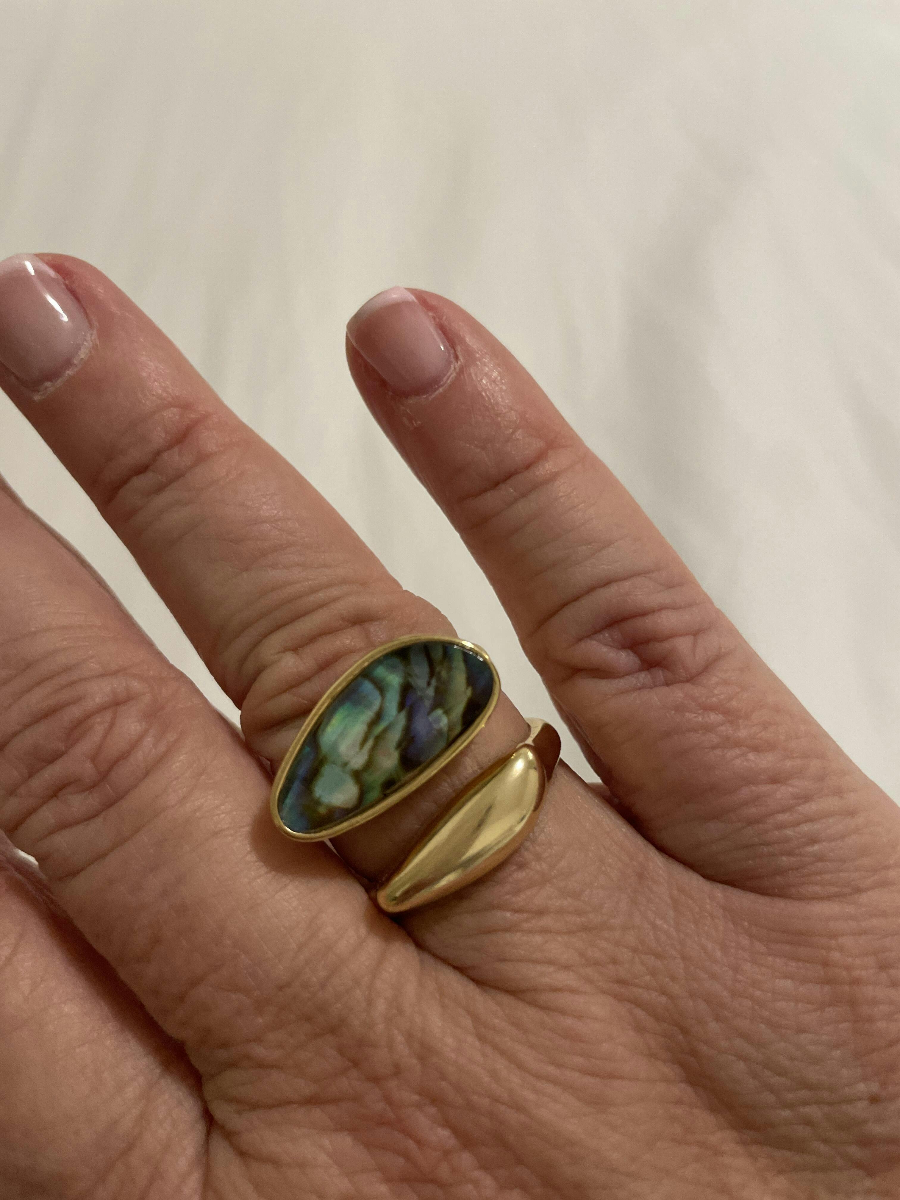 This 18K gold-plated ring showcases a stunning seashell gemstone—abalone or sea opal nautilus—known for its natural iridescent shimmer. Designed to catch the light beautifully, this ocean-inspired ring adds an elegant, organic touch to any look. The high-quality gold plating ensures lasting shine and durability, making it a timeless statement piece for everyday wear or special occasions.