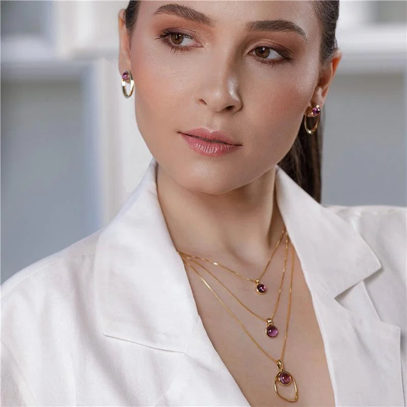This elegant 18K gold-plated set includes a necklace and matching earrings adorned with amethyst gemstones. Known for promoting wisdom, balance, and protection, amethyst also helps calm emotions while symbolizing clarity and spiritual elevation.
