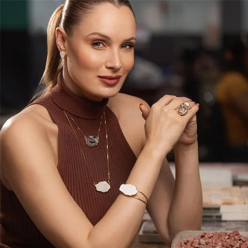 This 18K gold-plated set combines timeless elegance with natural beauty, featuring delicately crafted earrings and a matching necklace. The fragmented selenite gemstones add a subtle luminescence, while the natural geode centerpiece offers a unique, organic touch. Expertly designed to enhance both casual and formal attire, this set delivers refined sophistication with a connection to nature’s raw elements.