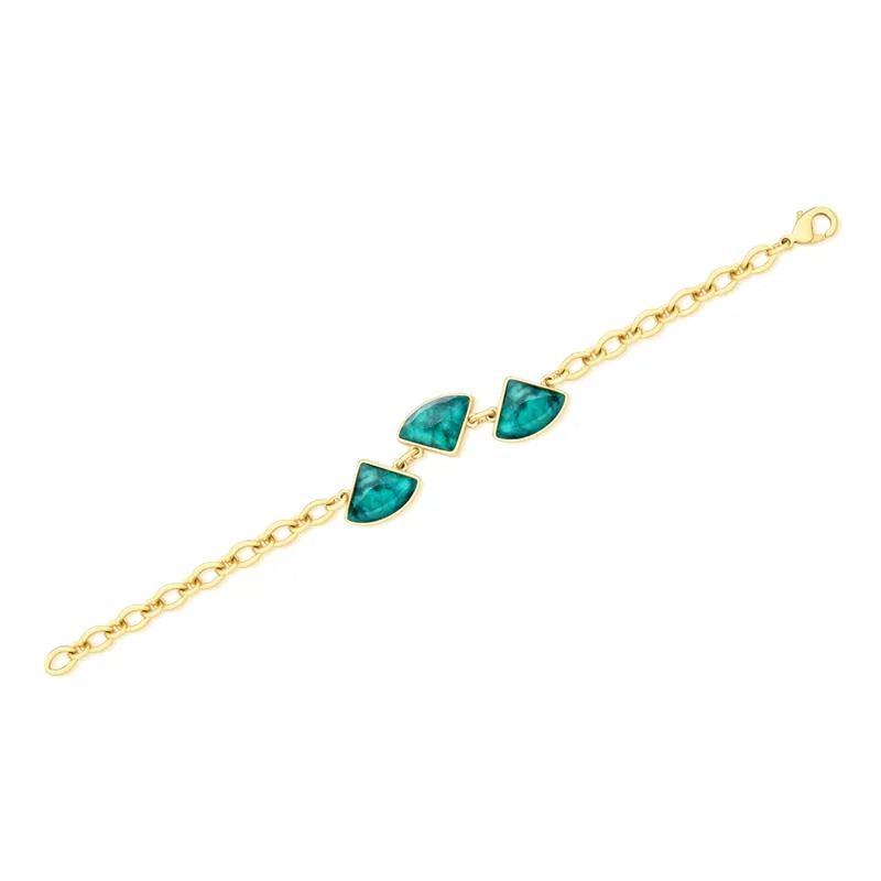 This elegant bracelet is 18K gold-plated with beautiful emerald gemstones. The emerald, with its vibrant and deep color, reflects the continuous renewal that women experience, whether in their role as leader, mother, creator, or dreamer.