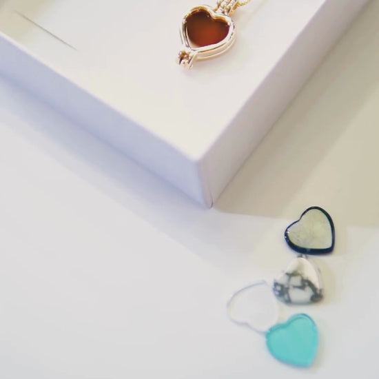 This elegant combo necklace features a heart-shaped locket pendant paired with seven natural stone plates, each measuring 12x13mm in a matching heart shape. Crafted for versatility, each set is unique, allowing you to interchange the stones and customize your look effortlessly.