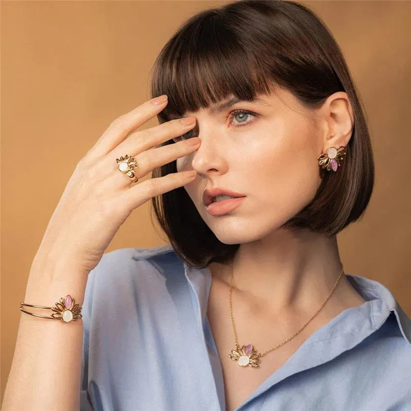 Inspired by the sunflower—a symbol of vitality, joy, and renewal—this 18K gold-plated jewelry set showcases striking, elegant shapes. Its center features fragmented selenite gemstone, complemented by marquise-shaped amethyst gemstone that echo the delicate petals of the flower.